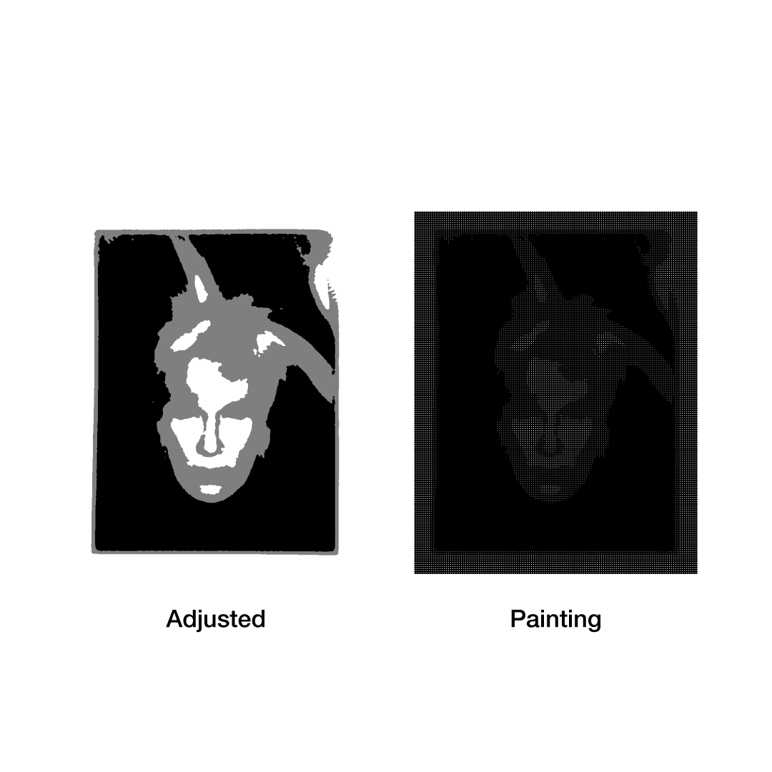 A painting reconstructed from the features (latents) recognized by AI in a portrait of Andy Warhol. Warhol reduced art to the surface. Today, AI likewise processes the world superficially through vast computation. Even words and concepts are transformed into visual images; everything becomes retinalized. This work overlays that excessive surface condition onto Warhol’s portrait, rendering it as a painting that functions like a screen.