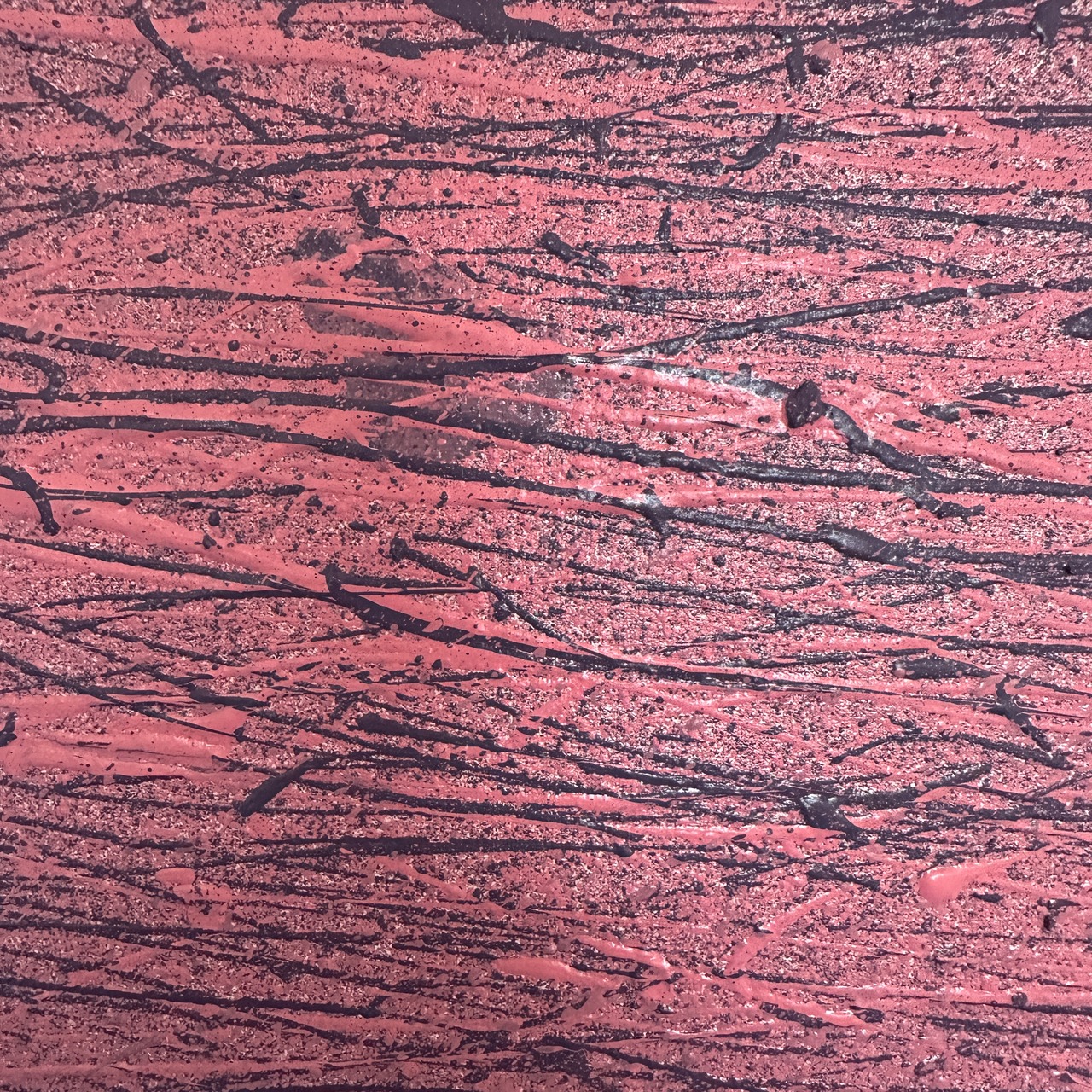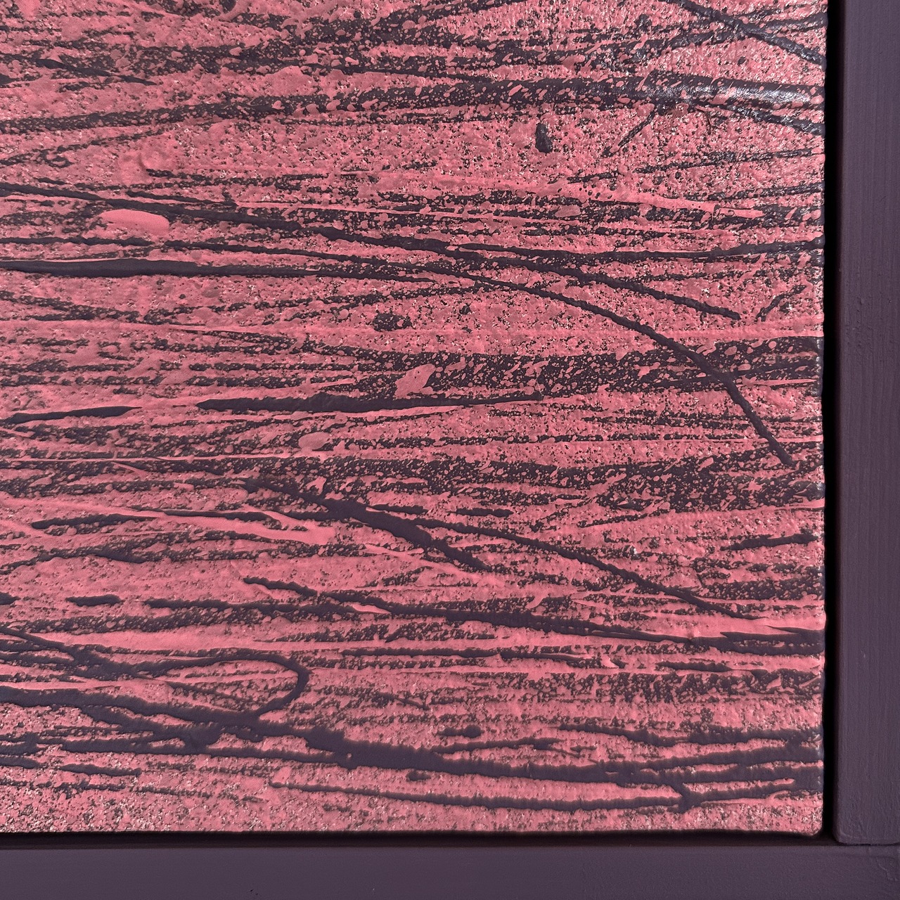Marks #004: 力強く重なり合う色彩のラインが、キャンバスの上にエネルギッシュな集積を生み出しています。近くで見ると絵具の盛り上がり(テクスチャ)が立体的に感じられ、照明の当たり方によって表情を変えるのが特徴です。